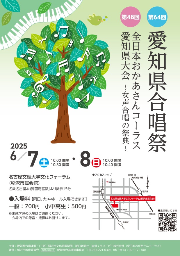 2025年度合唱祭・ 全日本おかあさんコーラス愛知県大会は 皆様のおかげをもちまして無事終了いたしました。 次回は、2026年6月13日(土) 14日(日) 名古屋文理大学文化フォーラムにて行う予定です。 皆様のご参加、ご来場をお待ちしております。 2025年度チラシ(PDF) (JPEG) <愛知県合唱連盟60周年記念委嘱作品> 音楽の木(2021/6/12初演) YouTubeにて公開中